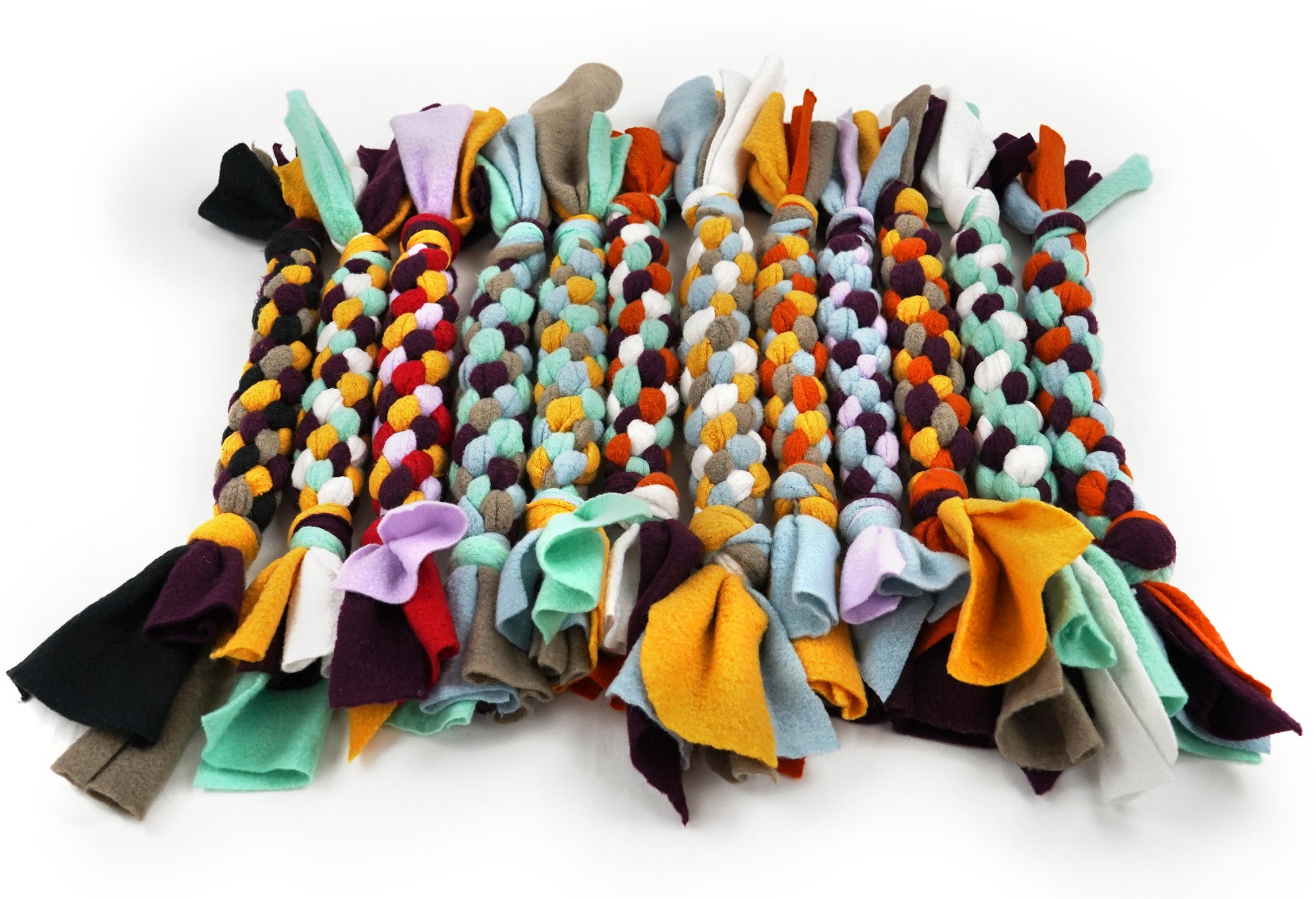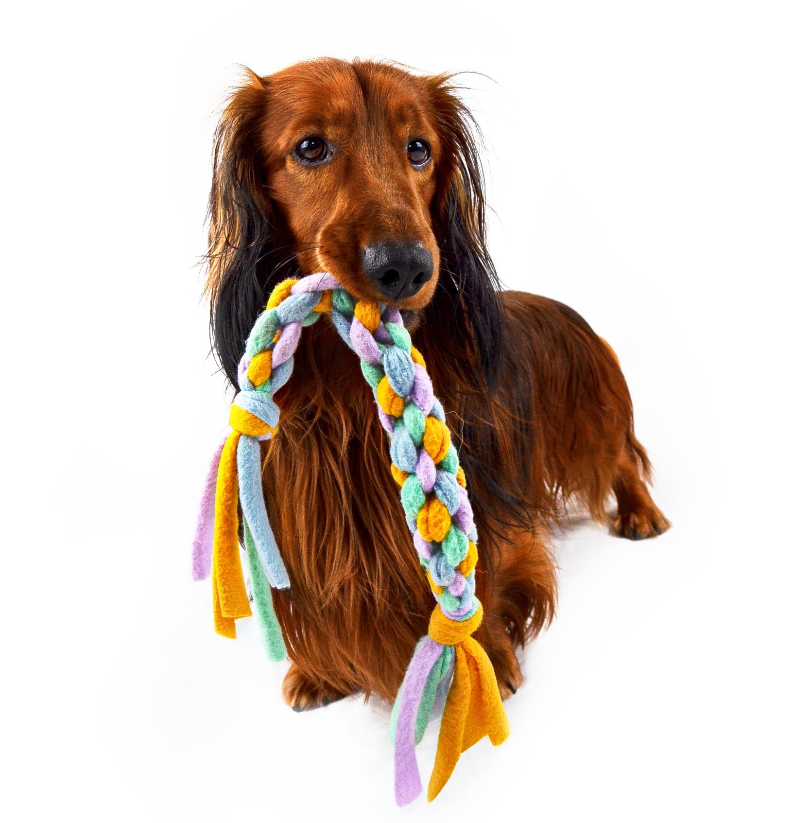 Denna leksak är perfekt för både apportering och kamp, designad för att ge både underhållning och träning för din hund. Tillverkad för hand med omsorg och hållbarhet i fokus, är leksaken flätad i mjuk fleece av återvunnen polyester – ett miljövänligt alternativ.