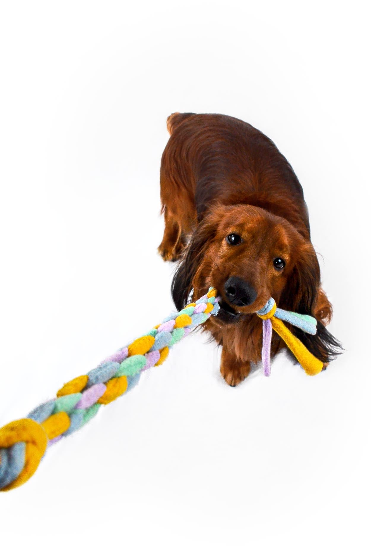Leksaken är utformad med två knutar och har en töjbar effekt som gör den lämplig för lättare dragkamp och lek. Perfekt för aktiva hundar som älskar att leka och tränas!