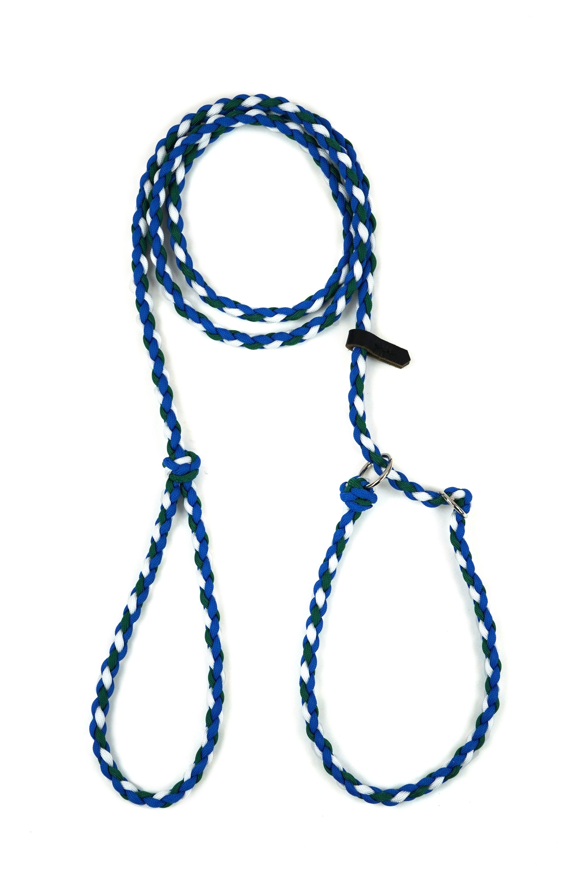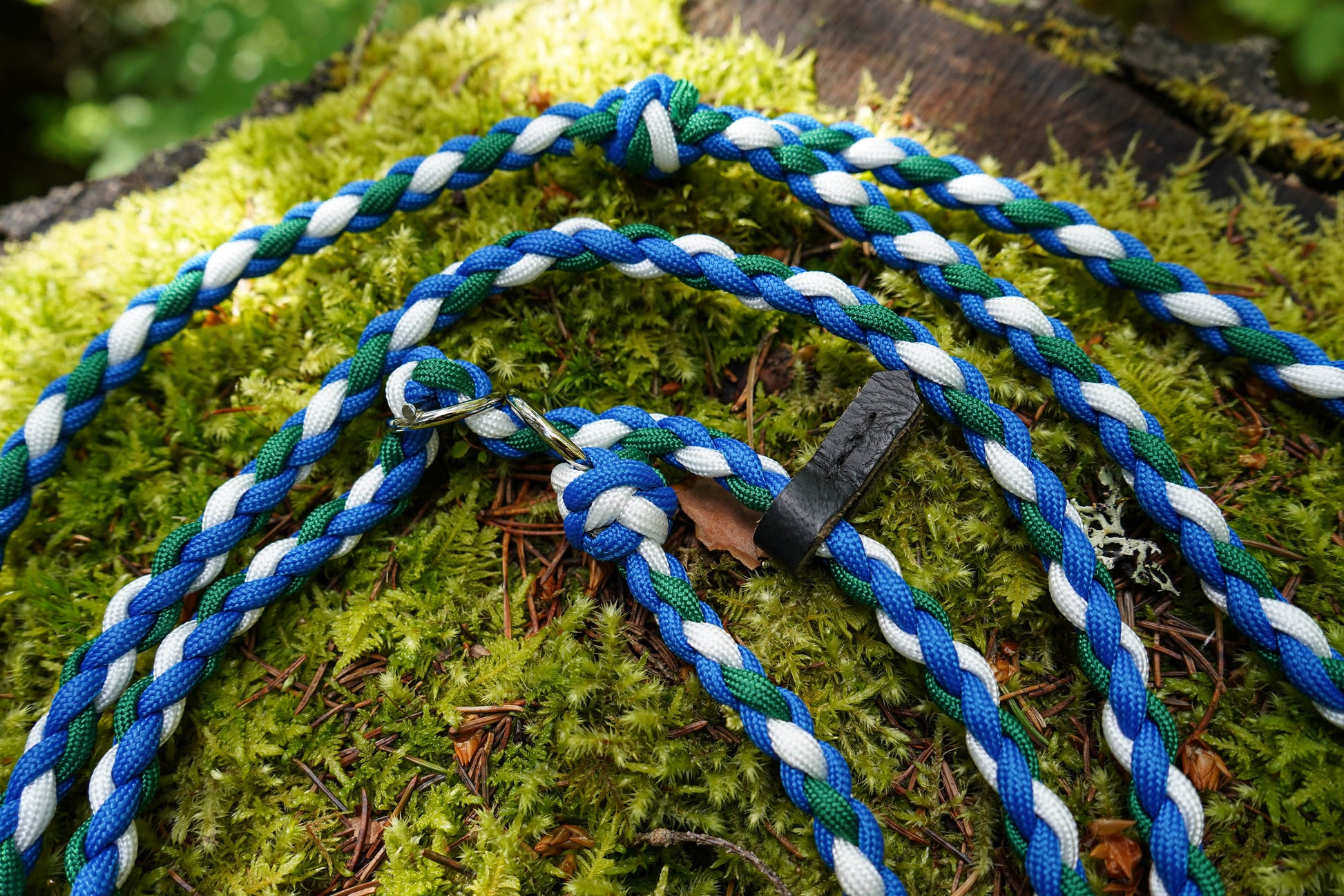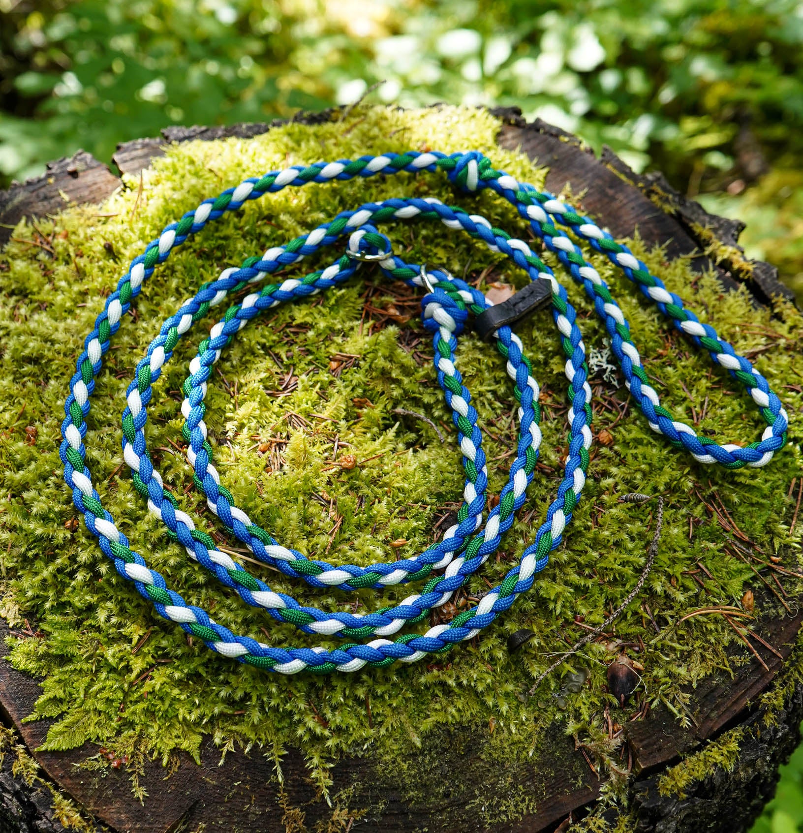 För dig som bär fjällen i hjärtat, ett retriverkoppel i Jämtlands färger. Flätat för hand med slitstark paracord i vitt, grönt och blått.